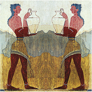 Copy of a fresco in the Palace of Knossos in Crete with a Minoan and an amphora aromatized with olive oil, as a gift to the Mythical King Minos. The “rhyton carrier” (carrier of a large conical rhyton vessel) is represented as sunburnt, with curly hair, strong shoulders and a thin waist, features of an ancient Minoan. The fresco was discovered during the extensive excavations by Sir Arthur Evans (1900-1913 and 1922-1930) and adorns the long ceremonial entrance of the “Corridor of the Procession” which is located near the western entrance of the Palace of Knossos.