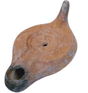 Clay lamp decorated with a cross in the center.