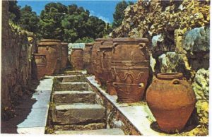 Copy of 275-year-old clay jars that the ancient Minoans had in the palace of Knossos in Crete in 3000 BC. Clay jars were at that time the modern way of storing and preserving olive oil during the heyday of the Minoan civilization in Crete, 3000-1450 BC. In the excavations of the palace from 1878 to 1930, jars of various sizes were found which were used by the Minoans to store olive oil, wine and grain. A recent study has shown that the estimated olive oil needed in a rich house in ancient Athens during the 5th century BC was 200-300kg per year, a very large amount, if one takes into account the extremely low efficiency of olive trees at that time.