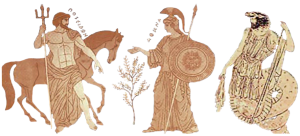 Copy of the representation of the dispute between the Goddess Athena and the God Poseidon in the presence of King Cecrops, who reigned in 3000 BC., about who will give his name to the most brilliant Greek city-state. This representation is found on a black-figure krater (vessel) of the 5th century BC. According to the myth, the goddess Athena gave the citizens of Athens an olive tree as a source of wealth and nourishment for the population. On the contrary, the god Poseidon, as god of the sea, struck his trident on a rock and sea water flowed out which was unfit for consumption by the inhabitants of the city. In this way, the goddess Athena managed to be elected the protector of the city and that is why the city got her name. Indicative of the importance of the olive to Ancient Athens was that the Athenians on their coins depicted the goddess Athena with an olive wreath on her helmet and an amphora of olive oil or an olive branch.