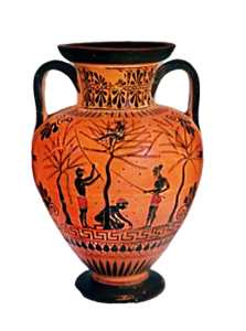 Copy of a 40,6cm-high black-figure Attic amphora from 530-510 BC in which the process of harvesting olive fruit by eunuchs is depicted. Today, the authentic Attic amphora is on a permanent display in the British Museum. It depicts three “Mories”, namely olives trees. On the middle olive tree is seated a young eunuch who shakes down olives so that they fall to the ground. On the right and left there are another two young men who beat the olive tree with their sticks. These trees are called Mories , as according to the myth of the time, all olive trees originated from molecules/pieces of the first olive tree that dominated the sacred rock of Acropolis in Athens. Herodotus, the father of history, wrote in 500 BC. that the cultivation and export of olives and olive oil was so sacred that only virgins and eunuchs had the possibility to cultivate estates with olives. After the Peloponnesian War, (431-404 BC) the Athenians faced a serious problem with olive moles. Many of the olive trees had been burned during the war, but no one was allowed to clear the burnt logs through the olive groves of Attica, nor to disturb the sacred enclosures that had been placed around them.