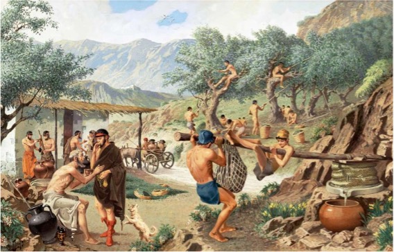 Olive oil has always been a basic element of the Greek diet since ancient times. There were three grades of olive oil. “Omotrives or omphakinon’’ namely the top quality olive oil that was produced from unripe olives, the equivalent of today’s “agourelaio” (early harvest olive oil). “Defteron Yevmatos” namely the good quality olive oil, the equivalent of today’s extra virgin olive oil and “Hydaion Elaion” namely the lower quality olive oil from overripe black or beaten olives, the equivalent of today’s lampante (bulk oil). More specifically, with the 1st pressing of the fruit, they got the olive oil for their food (omotrives or omphakinon and defteron yevmatos). With the oil from the 2nd pressing they made ointments for the body and the face. The oil from the 3rd pressing was used to power their oil lamps (bulk oil).