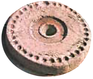 Copy of Kernos (pottery ring or stone tray) of the Palace of Malia, in Heraklion, Crete (1900 BC) and Kernos in the island of Syros (2300-2000 BC). The Kernos of the Palace of Malia was discovered in 1915-1921 during the archaeological excavations in the area. The multiple upright Kernos belongs to the Early Cycladic period and was discovered in Syros in 1991-1996. Kernoi (in plural) were dented stone or ceramic containers or smaller vessels. Both were used as containers to put nuts, fruits or other products to offer to the shrine of the gods. This ritual and process was the way for people to express their gratitude for the rich fruitfulness of the land in the past year.